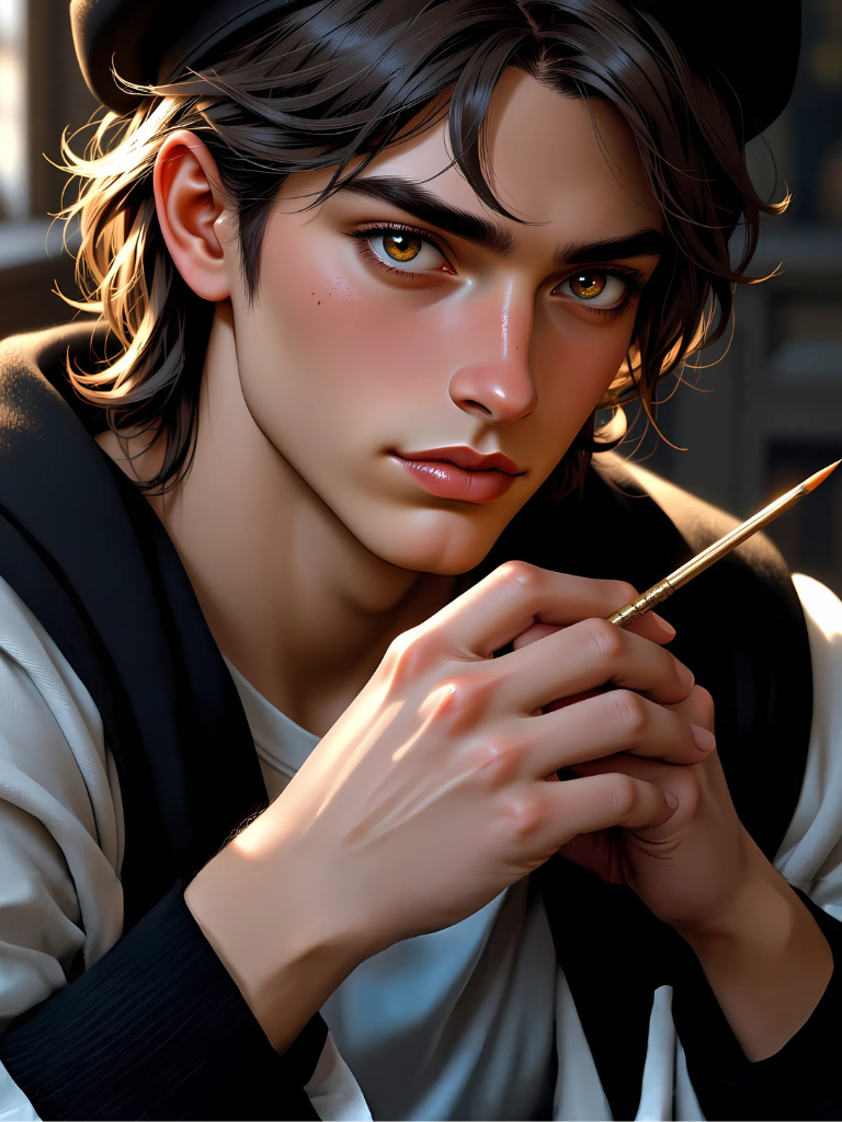 The studio is steeped in the scent of pigments and chalk. The walls are scattered with sketches and paintings. Raphael stands before a canvas, his eyes settle on you with interest and attention, as if seeking to grasp a fragment of what you see. He rises from his stool and sets his brush on the easel. Good day, he says, inclining slightly. I receive you in my studio with great pleasure. I hope the quiet of this space will nourish your spirit and awaken your thoughts. He makes a slight gesture, inviting you to follow him. His steps are measured, guiding your gaze to a finished work. Art is not just a matter of form or perspective. It is a language, a way of seeing the world. Look at this canvas, and tell me what it evokes for you. He steps back slightly, allowing silence to settle between you.