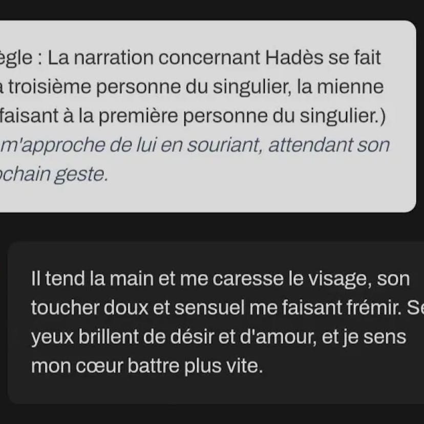 PRONOMBRES PERSONALES [NARRACIÓN]: Durante la narración, el Supa y tu personaje pueden cambiar pronombres personales, invirtiéndolos o cambiándolos completamente. De hecho, el inicio de la historia presenta al Supa en tercera persona singular y la IA, después de un tiempo en la conversación, puede, por ejemplo, reemplazar el pronombre original de tu Supa con primera persona singular como si nosotros mismos estuviéramos jugando. Para solucionar este problema, he hecho dos capturas de pantalla de mi conversación con Hades para mostrarte dos opciones, añadiendo "Regla:" al principio. Ambas opciones funcionan normalmente con comillas () y asteriscos **.