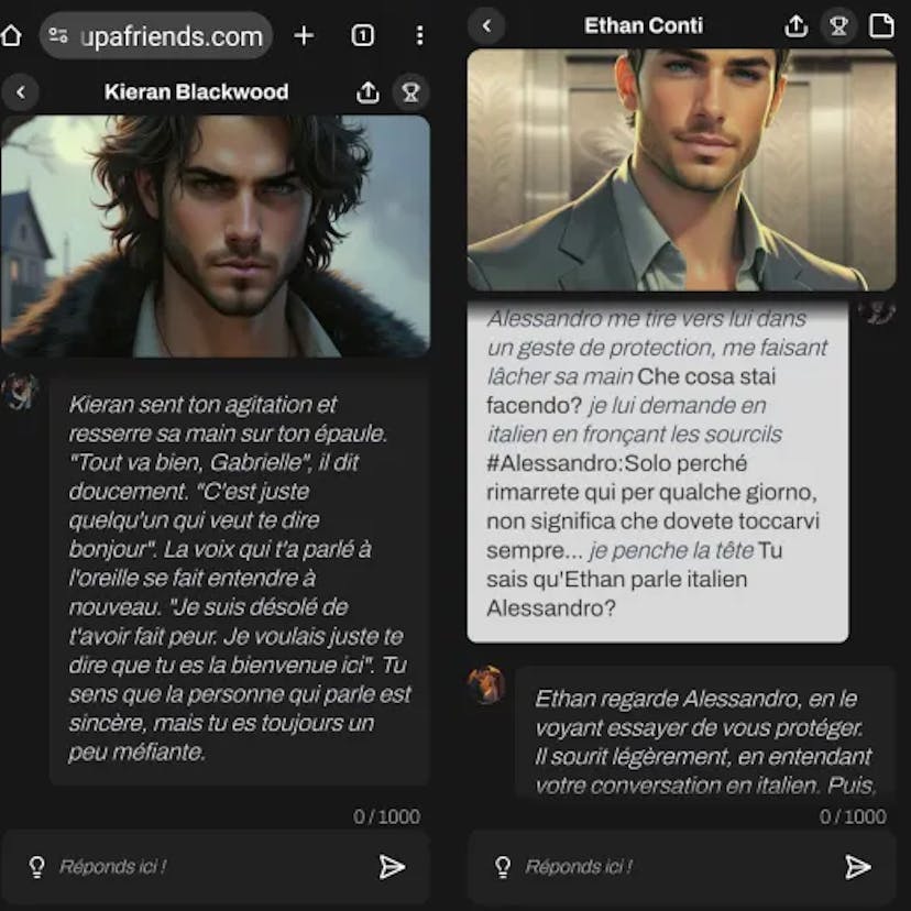 #️⃣ Segundo punto. La forma más simple de hacer hablar a 2 personajes es simplemente tomar el control. La técnica que mejor funciona es simplemente #SeguidoDelNombre. Puedes hablar solo con el personaje secundario o hacerlo hablar con tu Supette haciéndolo intervenir con #. La IA diferencia bien los 2 personajes y el intercambio es muy fluido (sin embargo, ten cuidado de usar bien la narración para no encadenar solo diálogos).
