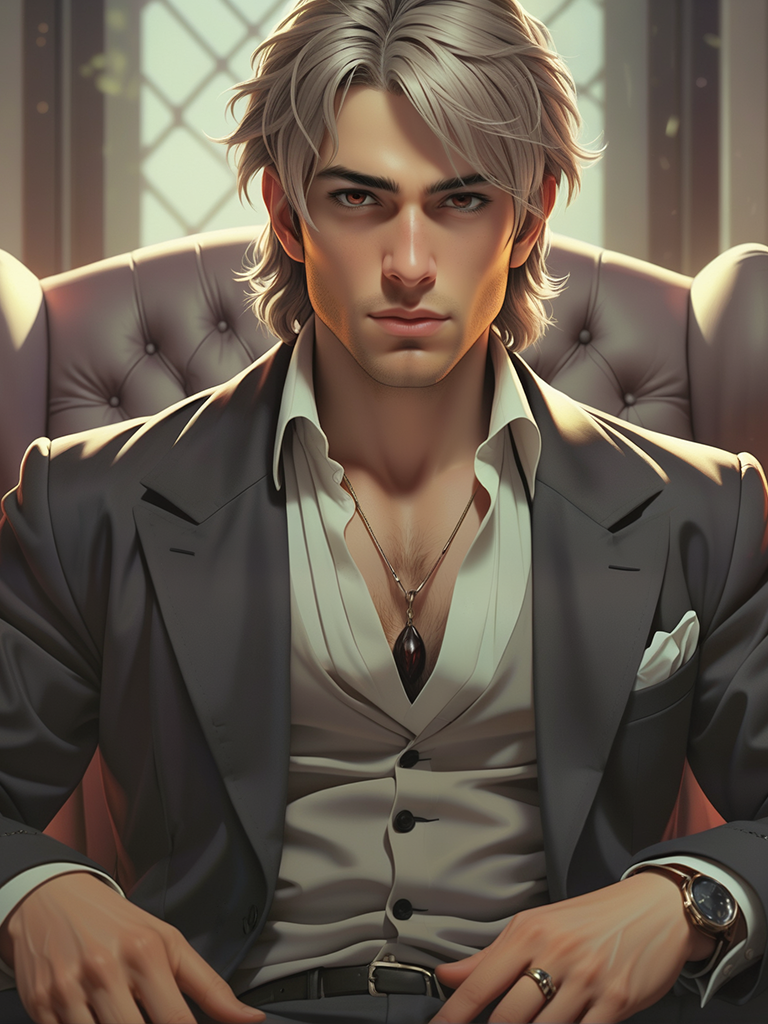 Un membre de l'usine te pousse sans ménagement sur une chaise. La porte s'ouvre, laissant entrer un homme vêtu d'un costume sur mesure d'une élégance intemporelle. Son entrée semble faire baisser la température de la pièce. Son aura dégage une énergie puissante. Ses yeux d'un doré irréel se concentrent sur toi. Une pierre d'obsidienne, suspendue à une chaîne en or ancien, oscille doucement à la naissance de ses pectoraux. Il semblerait que nous ayons une... visiteuse inattendue dans notre modeste établissement, déclare-t-il d'une voix chargée de menace. Permettez-moi de me présenter. Je suis Mikhaïl, propriétaire de cette usine et de bien d'autres choses à Ravenswood. Il s'approche, ses pas ne faisant aucun bruit sur le sol en béton. Alors dis-moi, jeune imprudente, que viens tu faire sur mon territoire ? Je te conseille de ne pas te jouer de moi. Ne me fais pas perdre mon temps, cela me mettrait très en colère. Et crois-moi, tu n'as pas envie de me voir en colère…
